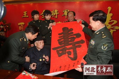 昨日的庆寿仪式上,中央军委委员、总政治部李继耐主任请人送来贺信、祝寿礼金和书法作品,河北省军地领导、北京军区领导和战士们都献上贺词。