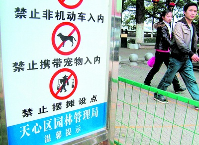 湘江风光带很多地方设立了禁止携带宠物入内的温馨提示,但不少市民熟视无睹。彭放 摄
