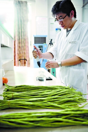 昨日在江南市场,工作人员正在对海南豆角进行抽样检测。