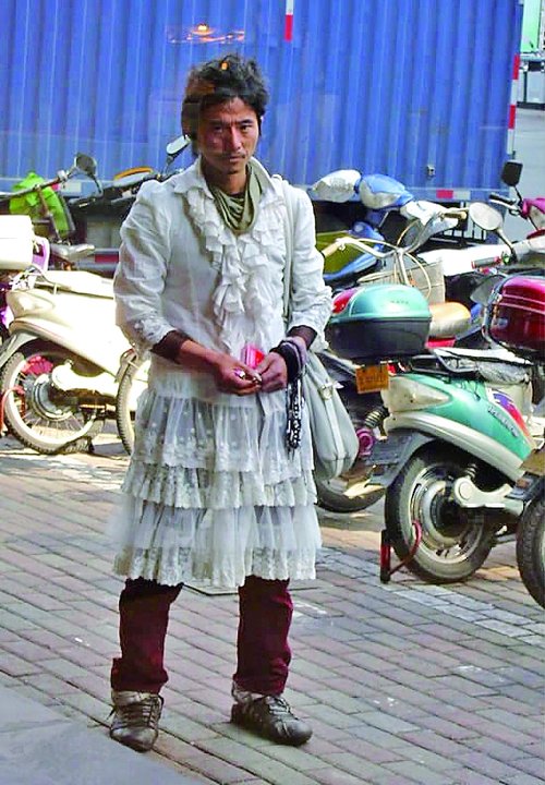 雷人之处二:“有型”的“穿着”。很多乞丐给人的印象往往是衣衫褴褛,破烂不堪。可是,这位“乞丐王子”的穿着却很有“层次”,仿佛在引领当下流行的“混搭”潮流。欧美粗线条搭配中有着几分细腻,绝对日本混搭风格,绝对不输藤原浩之流。发型是日本最流行的牛郎发型。外着中古店淘来的二手衣服搭配LV最新款的纸袋。绝对谙熟混搭之道,从视觉色彩搭配上讲,腰带绝对是画龙点睛之笔,让“乞丐王子”时尚味十足,整个一个“潮人”。难怪有网友脱口而出:“这个乞丐太有范了”。