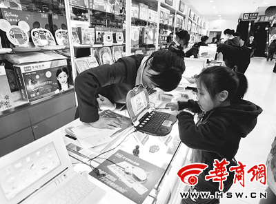 25日,一小学生在柜台前了解学生电脑的功能 本报记者 王警 摄