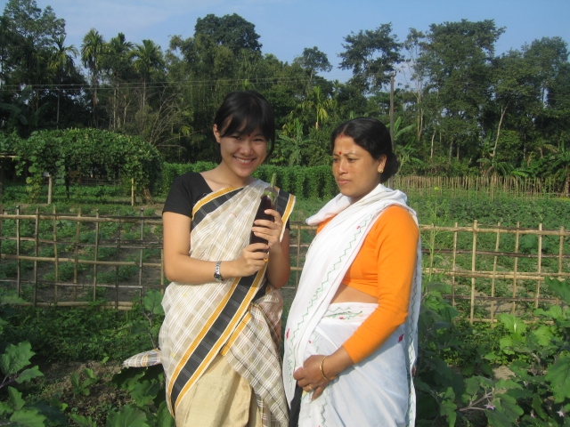 【马宇歌利用自己留学读研第一学年2009年12月5日开始放的国外首次寒假,在当月 12月15日回中国家里度假之前,来到印度东北部的阿萨姆邦农村进行为期一周的乡野调查。图为一身当地装束的马宇歌(左)手持地里采摘的茄子,与当地农妇在一起。】