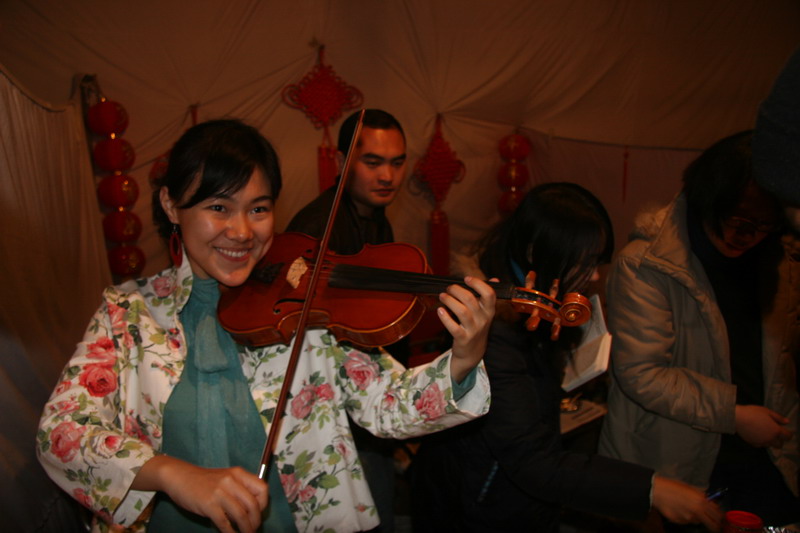 【附印度国家主流媒体《印度时报(德里专刊)》2010年2月6日第14版 校园版,该报本国记者撰写的《尼赫鲁大学国际食品文化节》一文原发链接如下 http://timesofindia.indiatimes.com/life/parties/delhi/World-on-your-platter-at-JNU/articleshow/5539131.cms 该文附图中正在尼赫鲁大学拉小提琴的女孩就是上述报道提到的马宇歌。照片所示那天为2010年1月26日,马宇歌在中国学生会设的展位上,应邀为前往尼赫鲁大学参观的贵宾们献上了自己拿手的小提琴独奏,反响热烈广受欢迎。图右二是马宇歌在清华大学上大学时的同班同学和室友张旭(女,北京人)。马宇歌2009年7月到尼赫鲁大学读研,她在清华大学同宿舍的同班同学大学毕业当月都到这所大学一起来读研了,另一人是李菁华(女,湖南人,没在上图)。】