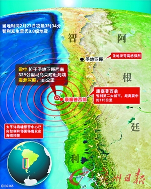 又讯 央视连线专家称,智利地震震源浅、破坏性大,强度相当于海地地震80倍。