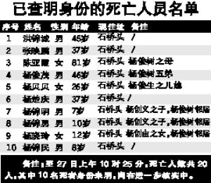 截至目前, 7名重伤者经全力抢救无效死亡,死亡人数增至20名;在其余49名受伤者中,病情危重8名,病情相对平稳41名。目前69名死伤者已有58名核实身份,其中已查明身份的事故死亡人员10名。