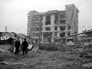爬到废旧民宅顶层,记者发现周围居民门窗玻璃全震裂。开日杂店的杨大哥说,爆炸时他们全家站在楼上观看,突然“地震”般巨响,家里玻璃被震碎,纷纷落到脸上,他家的小男孩脸蛋被擦伤,幸好没什么大碍。