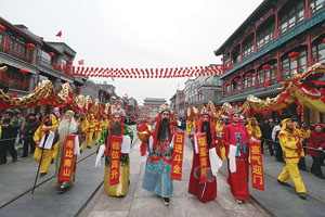 在上午的前门“踩街”表演中,“福禄寿喜财”五星惹得游客连连喝彩 摄/记者郭谦