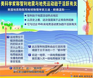 美国《纽约时报》27日援引地震学家的话报道,纳斯卡板块与南美洲板块相向运动,积聚应力,加上1960年9.5级地震对断裂带所施应力,以致触发这次智利强震。