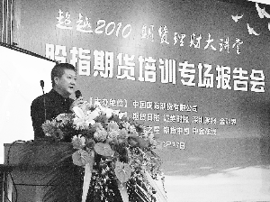 本报记者周江南 通讯员刘璞报道 股指期货或于3月18日开始正式交易,让一众投资者或观望或急切,针对开户过程中手续较为繁琐等问题,中国期货行业的龙头老大——中国国际期货有限公司面向全国推出了《超越2010-期货理财大讲堂-股指期货培训专场报告会》,为投资者答疑解惑。2月27日下午,记者在报告会现场感受到投资者对于股指期货的学习热情及对开户的谨慎。