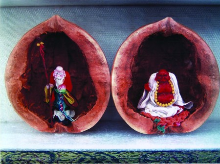 记者还在感慨各种人物的时候,董凤歧又拿出了微塑“核桃面人”,就是捏塑大约只有1厘米高的人物,将它们放在挖空的核桃里面。看到董老师拿出的“老寿星”和“大肚弥勒佛”,记者只能用叹为观止来形容了。人物虽小,但表情很丰富,衣纹发丝都有细致入微的刻画。在弥勒佛绿豆粒大的脸部,眉毛、耳朵、鼻子俱全,笑脸也很传神地表现出来。“你仔细看看弥勒佛的眼睛,黑白眼珠是分明的,看不清楚就拿放大镜看看。”董凤歧笑着说,她现在虽然70岁了,但眼不花,现在再做核桃面人的时候,也不用戴眼镜。