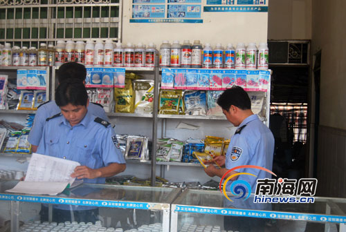 2日下午,南海网记者随同海南省农业厅督查组、陵水农委工作人一道来到陵水县英州镇,对该镇2家销售高毒、剧毒农药的农资店进行查处。