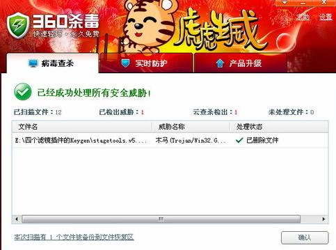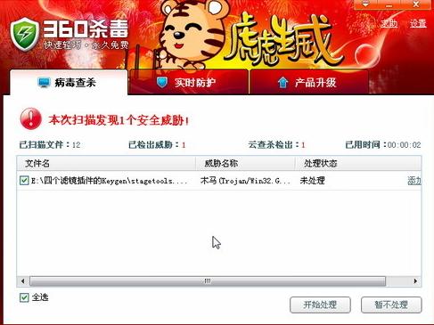 换装360杀毒双引擎版后,再查带毒插件的副本,一样也查到了,只是处理方式更人性化一点,由用户确定如何处理。当然你也可以在设置里将“发现病毒时的处理方式”设成“自动清除”。