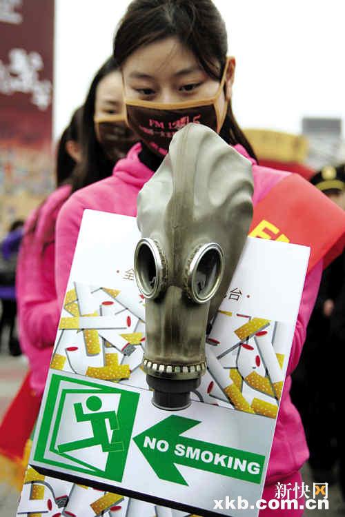 据新华社电3月1日起,《杭州市公共场所控制吸烟条例》正式实施,10类场所禁止吸烟,违者最高罚50元。这10类禁止吸烟场所包括医院、学校、博物馆、公交车、地铁、电梯等。公园、广场举行集会等重大活动时,禁止吸烟。杭州一家电台的女主播控烟宣传员手拿防毒面具和宣传板宣传控烟。