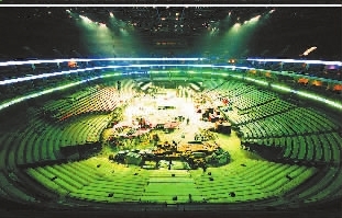 ▲2日,2010年上海世博会开幕庆典主场地———世博文化中心建设进入最后冲刺阶段。图为(拼图)世博文化中心主场地正在进行灯光调试。