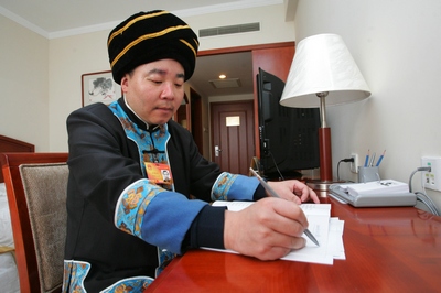 全国人大代表、湖南老爹农业科技开发股份有限公司总经理田儒斌身着土家族服装修改建议。特派记者 石祯专 摄