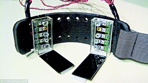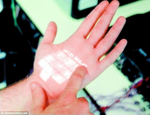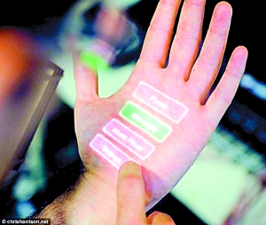 这款能在人的皮肤上投影出触摸屏界面的设备是一个名叫Skinput的臂带,由微软研究员和美国卡内基梅隆大学的研发人员联合设计。设备中包含了一个微型投影仪和一个精密的传感器,投影仪在人的皮肤上映出一个操作界面,如普通的触摸屏一般,人可以在这个界面上按键,传感器便可以分辨出皮肤上哪个部分被点击了,进而执行命令。