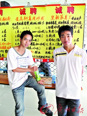 杨举荣出生于1989年,杨王邦出生于1991年,他们俩都是广西钦州人。3月4日,两个写着一脸稚气的男孩站在人才市场的招聘信息栏前不紧不慢地看着,眼神中明显透着对这个新世界的期待。他们都是前一天下午到顺德的。