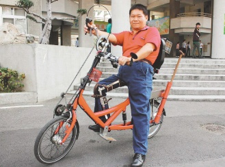 “我终于可以骑自行车兜风了!”他说,曾5度骑摩托车环岛,现在也可以骑自行车环岛;因手动自行车非常耗体力,最近他在自行车后方加装电动装置,电池充完电可以跑六、七个小时,手动骑累了,就转换成电动。