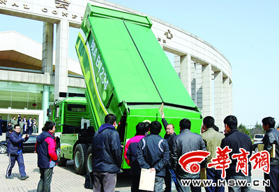 昨日,在动员大会会场外,一辆全封闭的新型渣土车吸引了很多与会者。该车能够在驾驶室全自动对车厢进行操作,并且可以全封闭本报记者 李晖 摄