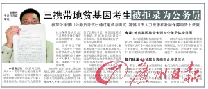 本报讯 (记者王广永)去年12月31日,由本报报道的佛山三名携带地贫基因的考生被拒录为公务员,被法律界人士称为“中国基因歧视第一案”(详见当日珠三角A25版)。