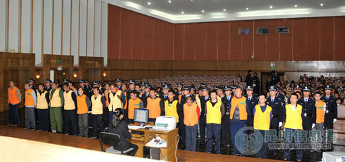 ????为保证庭审顺利进行,30多名特警护驾法院,站在昆明市中院的每道大门口。审理此案的第一法庭门口更是布上重岗,要想进入法庭必须过“三关”——两道安检、凭票进入。因被告人数众多,中院专门从五华区法院、西山区法院调来法警支援。