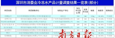 南方日报讯(记者/张玮通讯员/梁超美周珏)一袋冻墨鱼仔标注净含量是378克,但实测只有144克;一袋阿拉斯加狭雪鱼柳的净含量竟然与含冰量比接近1∶1!昨日,深圳市消委会发布的2010年预包装冷冻水产品计量调查报告爆出惊人结果,48批次抽查样品仅1批次合格,标注的净含量和实际净含量偏差率最高为-61.9%(偏差率=(实测净含量-标注净含量)/标注净含量),最低为-1.42%。而样品来源则全部购自沃尔玛、家乐福、吉之岛和山姆会员店等知名卖场。
