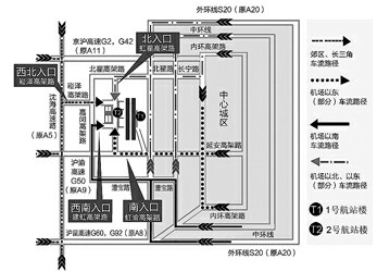 ■中心城虹桥枢纽以北地区的旅客,可通过城市快速路网及外环高速S20,经长宁路-北翟路接北翟高架路,从虹桥枢纽北口(即虹翟高架路)进出;也可利用天山西路、仙霞西路等地面道路至七莘路,根据相关标志指示进出;