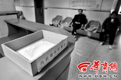 3月11日,西安市中心医院内科化验单放在盒子里,无人看管本报记者 张杰摄本报讯(记者张莉)“医院里的验血窗口,乙肝检测化验单放了一沓让自己取,这样不就泄露了患者隐私吗?”近日,有患者对一些医院化验单自取的管理方式提出质疑。
