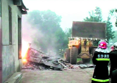 “接警后,我们紧急出动了4辆消防车。因为厂内有大量的镁铝金属原料,不能用水枪和泡沫灭火,干粉也不能迅速奏效,我们就在当地紧急调用了卡车和推土机,采用沙土覆盖方法灭火。推土机将起火厂房推倒后,足足用了15卡车干沙土,才控制住大火。”据现场的消防人员介绍,这类火灾需要专业的金属干粉灭火器才能有效地控制,目前,湖南并没有此类设备。