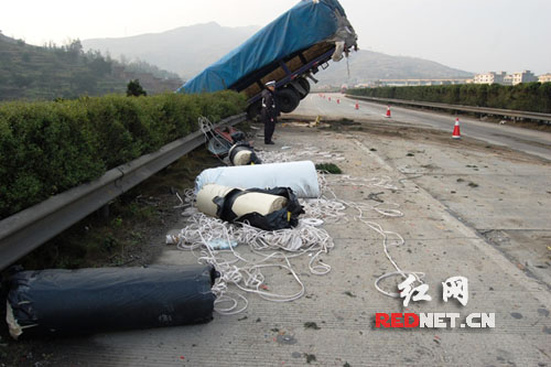 凌晨4时许,宜章中队夜巡民警谢胜平、刘辉巡逻至509KM往北路段时,发现在路肩的上方有辆大货车的尾部高高翘起。通过初步勘查得知,冀AH3697号重型半挂牵引车(挂车号:冀A1B98挂)由北往南行驶至该路段时,车辆向左越过中央波形护栏驶向由南往北车道后,冲出道路左侧波形护栏,坠落于护坡下,导致车辆的尾部翘起在公路上方,现场到处是公路设施及车辆的散落物,所幸没有造成人员伤亡。
