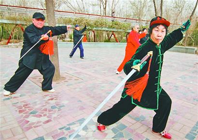 昨天上午8点,在泉城公园的丁香园,记者见到了罗金生夫妇。老两口正全神贯注地带着八九个“徒弟”练太极剑。微风中,十几位老人气定神闲。