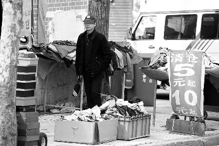 这个摊贩卖衣服就像卖菜。 这些外表皱巴巴,价格便宜惊人的衣服,其“身世” 可疑。记者盛文静摄