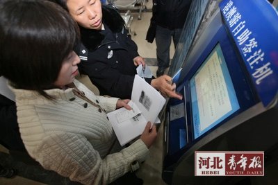 河北青年报讯(记者白云)昨日,石家庄市公安局出入境管理处自助签注开通仪式上,一台机器吸引了许多前来办理港澳签注业务的市民。过去,已经办理过港澳通行证想再次办理签注的市民,必须到出入境管理处填写申请单、贴好照片、排队叫号等待民警办理。从昨天开始,通过这台机器,这些市民可以自助办理签注业务,省去了填单排队的程序。据悉,此举为全省首家。
