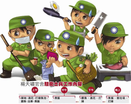 中国台湾网3月19日消息 综合台湾媒体报道,台湾“监委”余腾芳、马秀如去年12月2日无预警突袭台陆军司令上将杨天啸官舍(台北市信义营区),调查驻卫士兵执勤情形,赫然发现士兵在正常站哨勤务外,不务正业,帮忙司令家买菜、炒菜、杀鱼、打扫,司令的配车还变成载司令妻子的“夫人车”,一干台军士兵全沦为司令家中私人的佣人。“监委”痛批严重影响台军军誉及浪费公帑,昨日纠正台陆军司令部要求改正。