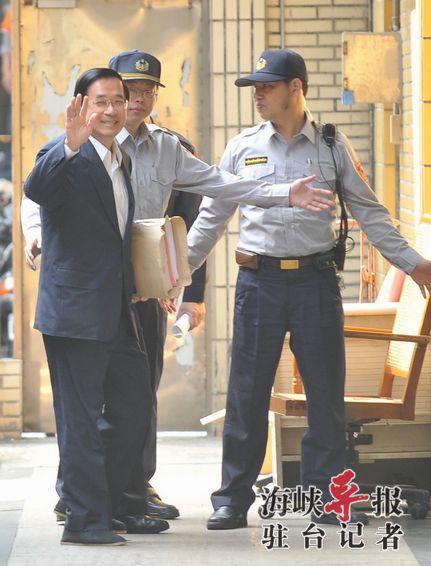 吴淑珍快进法庭时,媳妇黄睿靓有些坐不住 ,老是探身往门口看,而陈水扁则是眼盯审判长,一头也不转。