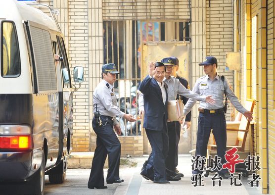 9时左右,阿扁的车到后面大院里面。我们不能拍摄,因为考虑到人权问题,这一块高院交给台湾“司法记者协会”(台湾跑司法口的记者组成的团体)去协调。司法记者协会就会排出班来,这周哪家报社的摄影记者进去拍,拍完后,相片大家拷回去共享。今天是轮到《自由时报》和TVBS进去拍。