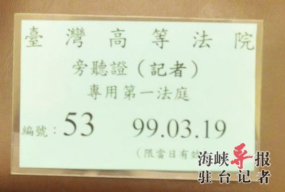 在入口处的右边区则是旁听席,共有十张长板凳,每个板凳坐4人,板凳背上贴有编码,共可以坐80人。其中给记者有60席(52席是给司法记者协会的,另外8席是给非协会的,记者拿的旁听证就是非司法记者协会的,53号)。剩下的20席是给旁听民众的,从这两周来看,民众席坐着都是陈水扁的支持者,很多是南部上来,以老人和妇女基多。开庭后不久,后面民众席上就有人打嗑睡,或是看报纸,但都被法警给制止了。