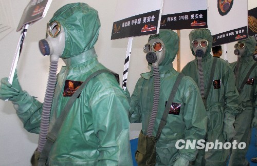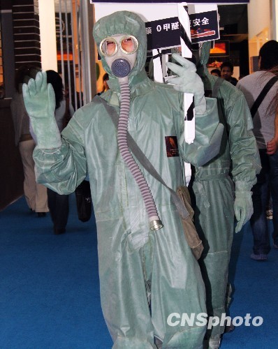 3月20日,在第25届深圳国际家具展上,一家参展商请的工作人员身穿防腐服,头戴防毒面具,宣传低碳环保。据悉,该展览会以“低碳生活方式的倡导与体验,创新设计理念的引导与实践”的主题概念,低碳成为本届展会最大的亮点。中新社发 吴赛锋 摄