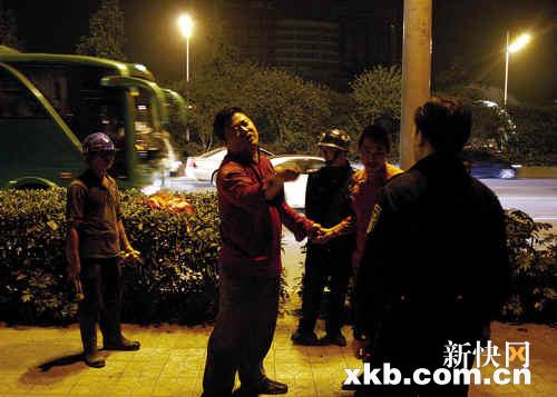 前晚9时43分,记者在现场看到,一名身穿红衣的中年男子摇摇晃晃穿行黄埔大道,过往车辆无不放慢速度,红衣男子还不停伸手拦截车辆,嘴里嘟囔着“停车!停车!”出租车司机尹先生正追上一名白衣男子,两人扭打成一团,随后白衣男子逃之夭夭。