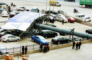 大风刮倒巨型广告牌砸坏十余辆汽车 奔流新闻 《兰州晨报》官方账号 2010.03.2109:51 关注 3月20日上午,济南二环东路附近一块巨型户外广告牌被大风刮倒,将一家汽车销售公司外场停放的十余辆汽车砸坏。当日上午济南市区阵风瞬间风力最强达到8级。 新华社照片