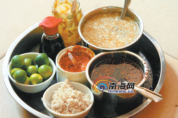 初来乍到、选择品尝海南菜的许多外地人总会很好奇,不管是在大酒店、餐馆还是在一些小餐馆,总会惊讶于“海南人吃饭怎么拿那么多碗,除了饭碗、茶杯还有汤碗,还总会有一个味碟。”而服务员随后拿上来的调味盒,让他们明白了,原来在享受美味时,海南人习惯了要醮酱料,或调制好的、或自己按口味来配的……如果有海南人同桌,还会告诉你这种是醮什么的,那种又是配什么的。
