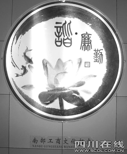 这个全国首创的工商文化标记以廉政建设为主题,属圆形墨笔画,具有强烈的地域特征和深刻的寓意:周围墨带是流经南部嘉陵江的地域写意,鱼跃水欢莲挺托起南部工商文化的精髓——“勤、廉、谐”3字。圆形寓其全心、全意、全方位为辖区的发展服好务,表明决心要取得圆满的业绩。