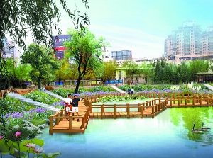 对于湖心岛的改造,则是将原来破损的地板换为整齐的青石板。同时将拆除“舒心亭”,建设一座既可供游人游玩,又可在湖中心登高远眺的“雁来阁”,打造成整个公园最核心的建筑。为方便游客登临,将在湖心岛北侧再架设拱桥,使南北两岸相贯通。