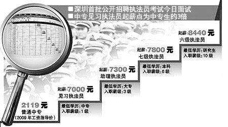 记者与深圳市2009年工资指导价位进行了比较,发现见习执法员的“起薪”是普通中专平均数的3倍以上,接近硕士及以上的平均标准7958元,而2009年特区内工资指导价平均数为每月3338元。