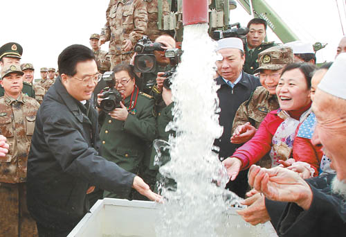 宁夏干旱地带缺水问题严重。2007年4月到固原市彭阳县陡坡村考察时,胡锦涛就很关注这个问题。2007年岁末,陡坡村村民写信向总书记报喜:兰州军区给水工程团为村里打了3口水井。胡锦涛看信后十分高兴,专门作出重要批示,勉励给水部队官兵再接再厉、做出更大成绩。两年多来,给水工程团官兵牢记总书记嘱托,大力实施百井支农富民工程,转战宁夏18个县区的117个自然村,为缺水群众打出159口井,送去了甘甜的清水。这次,胡锦涛专程前往永宁县胜利乡园林村给水工程团打井施工点,看望慰问正在紧张施工的官兵。部队负责人向总书记报告,正在施工的这口井已经打了4天,马上可以抽水。胡锦涛走到井位旁,启动按钮开闸抽水。很快,白花花的清水从井管流了出来。总书记和现场群众一起,用手捧起水来尝。一些群众激动地对总书记说:“感谢党!感谢解放军!”随后,胡锦涛视察了给水工程团野外生活和文化设施,嘱咐部队领导一定要搞好野外施工后勤保障,安排好官兵文化生活,让大家吃好、睡好,能洗上热水澡。