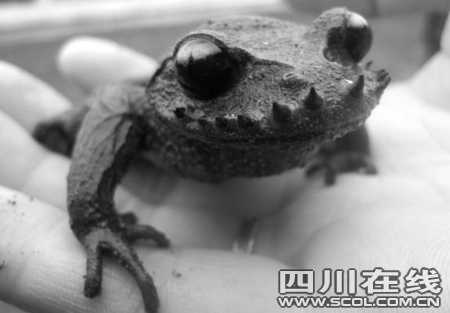 经生物专家辨认,这只青蛙学名髭蟾,也称“胡子蛙”,是我国特有的珍稀濒危两栖动物,在夹江尚属首次发现。