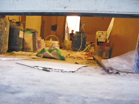 金湾华庭16幢靠近四明中路,一楼南侧是店面房,店面房后面就是小区住户的车库。昨天下午,记者来到现场时,陈女士说的那个车库里正有装修队忙着干活(上图)。