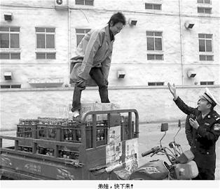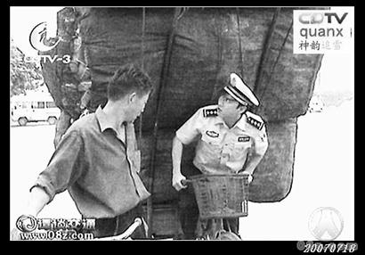 4、谭乔抓住一个骑电动车的人,他超宽超载运了几块很重的大木板。