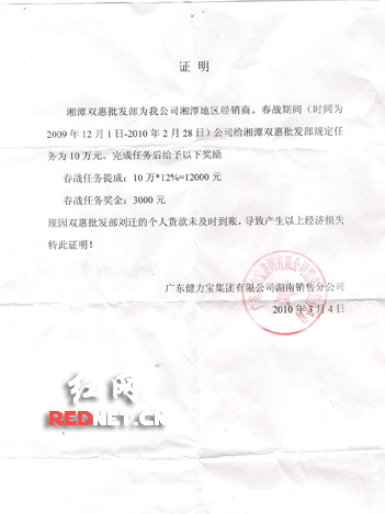 刘迁称,他在湘潭市区经营一家食品批发部,其中包括代理健力宝饮料的销售。根据与健力宝签订的销售合同,其批发部若能在虎年春节期间,完成10万元的销售任务,同时在2月28日之前将货款汇至健力宝公司账户,将会得到15000元的销售奖金。