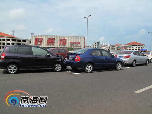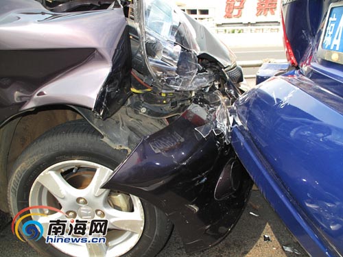海口世纪大桥3车追尾 轿车受损严重[组图]